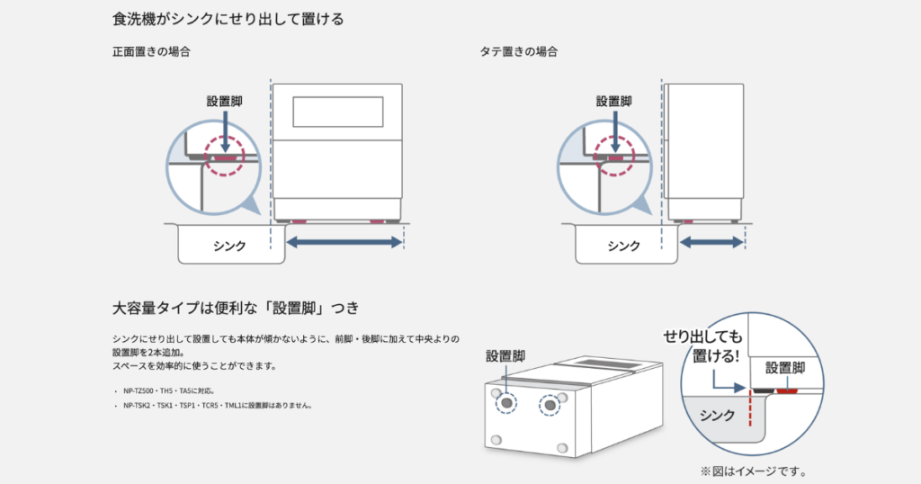 Panasonic NP-TZ500は「設置脚」というものがあるため、本体よりも狭い置き場所に設置することが可能になっています。