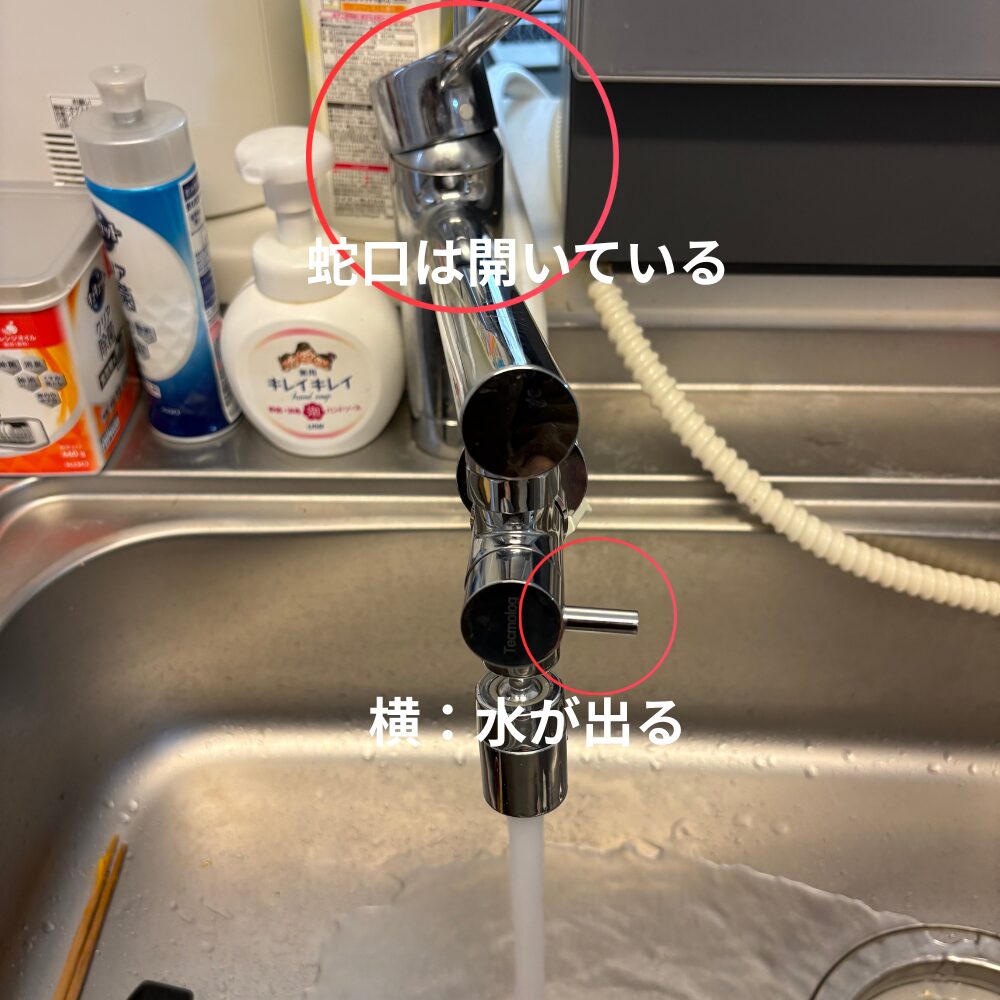 レバーが横を向いたら、蛇口から水が出てきます。