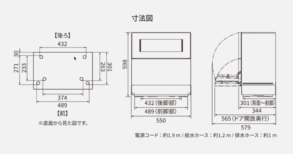 我が家では、24cm×55cmの幅で食洗機本体は収まっています。
