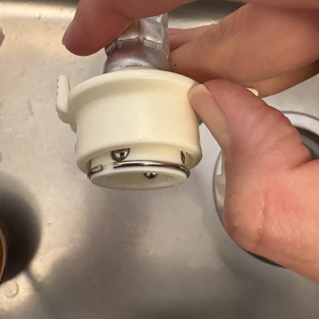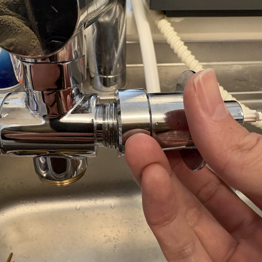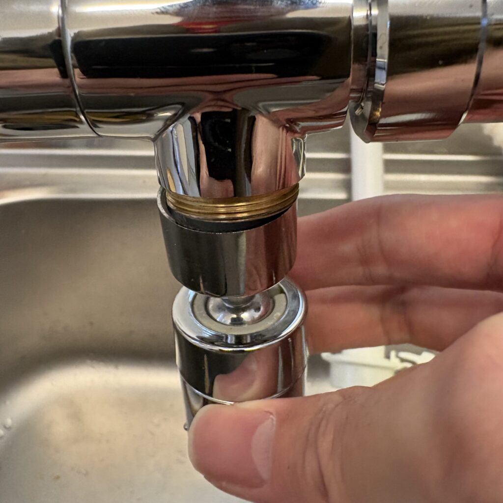 次に上記のアダプターを蛇口の先端にクルクルと取り付けます。